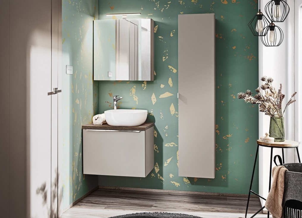 Ve skvělém moderním vzhledu se vyznačuje nejvyšší kvalitou zpracování materiál lamino v provedení Šedá / Dub Santa Fee. Skříňky mají tichý uzavírací systém, organizér do zásuvky a se zásuvkou ve skříňkách se zrcadlem.