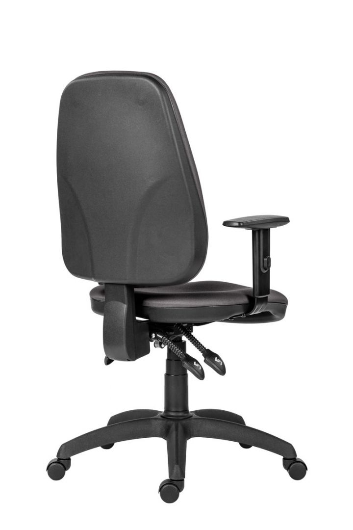 Kancelářská pracovní židle s vysokým opěrákem, ASYN - asynchronní mechanismus, nezávislé nastavení úhlu sedáku a opěráku s možností aretace v libovolné pozici, nastavení výšky opěráku mechanismem up-down, výškové nastavení sedáku plynovým pístem, plastová nebo ocelová chromovaná báze, kolečka Ø 50 mm pro měkké podlahy, volitelné područky, český výrobek.