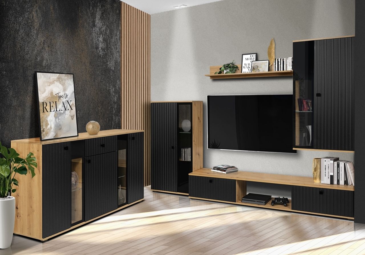 Moderní jednoduchá obývací stěna Vyzkoušejte originalitu s precizním řemeslným zpracováním v podobě moderní nábytkové sestavy do obývacího pokoje SALZA MDF. Tato sestava je díky své prostornosti a množství úložného prostoru praktickým pomocníkem v každém interiéru. Stylová nábytková sestava do obývacího pokoje dodá vašemu interiéru zajímavý vzhled a zaslouženou pozornost. Díky praktickému nábytku, budete mít vše přehledně uspořádané. Nábytková sestava je vyrobena z lamina a MDF vzorovaných dvířek tl. 16 mm, které věrně imituje reliéf dřeva. Tato moderní nábytková sestava je dostupná v oblíbených barevných dekorech: Bílá / Dub artisan, Černá / Bílá, Černá / Matera, Bílá / Matera, Dub artisan / Dub artisan, Černá / Dub artisan, Bílá / Bílá. Právě díky vnitřnímu uspořádání a stylovému barevnému odstínu, je tato nábytková sestava vhodná pro vybavení moderního interiéru.