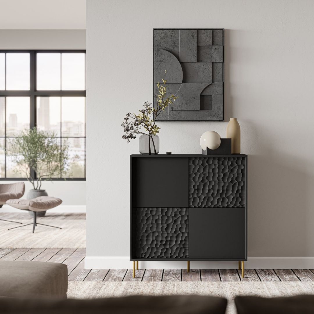 - je moderní komoda vyrobená z lamina a MDF desek v barevné kombinaci černé desky a zlatých nohou. Nábytek je vyroben z laminované MDF černé barvy s 3D dekorem na vybraných čelech skříněk. Zlatý detail v podobě tenkých nožiček působí velmi elegantně a luxusně.