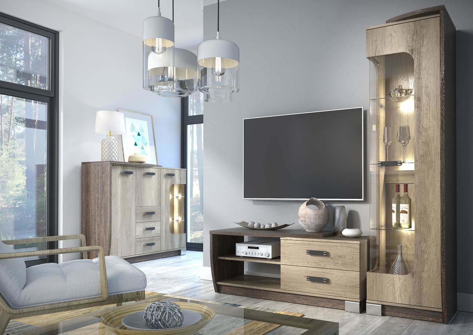 Vyzkoušejte originalitu s precizním řemeslným zpracováním v podobě moderní sestavy do obývacího pokoje ROMERO. Tato stylová sestava se skříní, TV komodou a vitrínou s prosklenou částí je díky své prostornosti a množství úložného prostoru praktickým pomocníkem v každém interiéru. Stylová nábytková sestava dodá vašemu interiéru zajímavý vzhled a zaslouženou pozornost. Díky praktické polici a zajímavě řešenému prosklení dveří, budete mít vše přehledně uspořádané a nejkrásnější dekorace můžete vystavit v prosklené části komody. Nábytková sestava do obývacího pokoje ROMERO je vyrobena z lamina, které věrně imituje reliéf dřeva. Lamino je tloušťky 16 mm s ABS hranou. Tato moderní sestava do obývacího pokoje je dostupná v oblíbeném barevném dekoru dub canyon v kombinaci s tmavým dekorem arusha. Na skříni a komodách se nacházejí designové detaily, které podtrhují celkový moderní vzhled tohoto moderního nábytku. Právě díky vnitřnímu uspořádání, ale také stylovému barevnému odstínu, je tato nábytková sestava vhodná pro vybavení moderního interiéru. Nábytkovou sestavu ROMERO lze zakoupit samostatně a nebo jednotlivé díly variabilního nábytkového systému ROMERO samostatně.