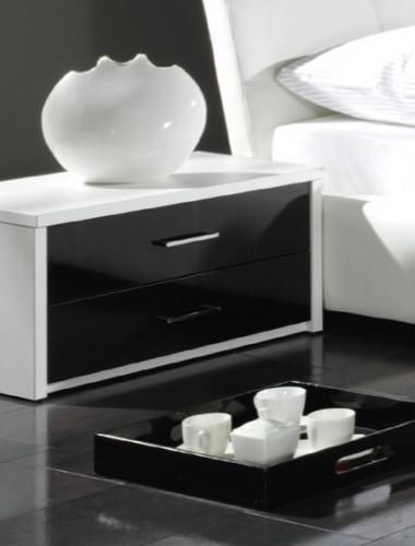 Noční stolek MEDIOLAN je vyrobený z lamina v barevném provedení Bílá perla a černá MDF ve vysokém lesku v šířce 65 cm, výšce 36 cm a hloubce 41 cm.