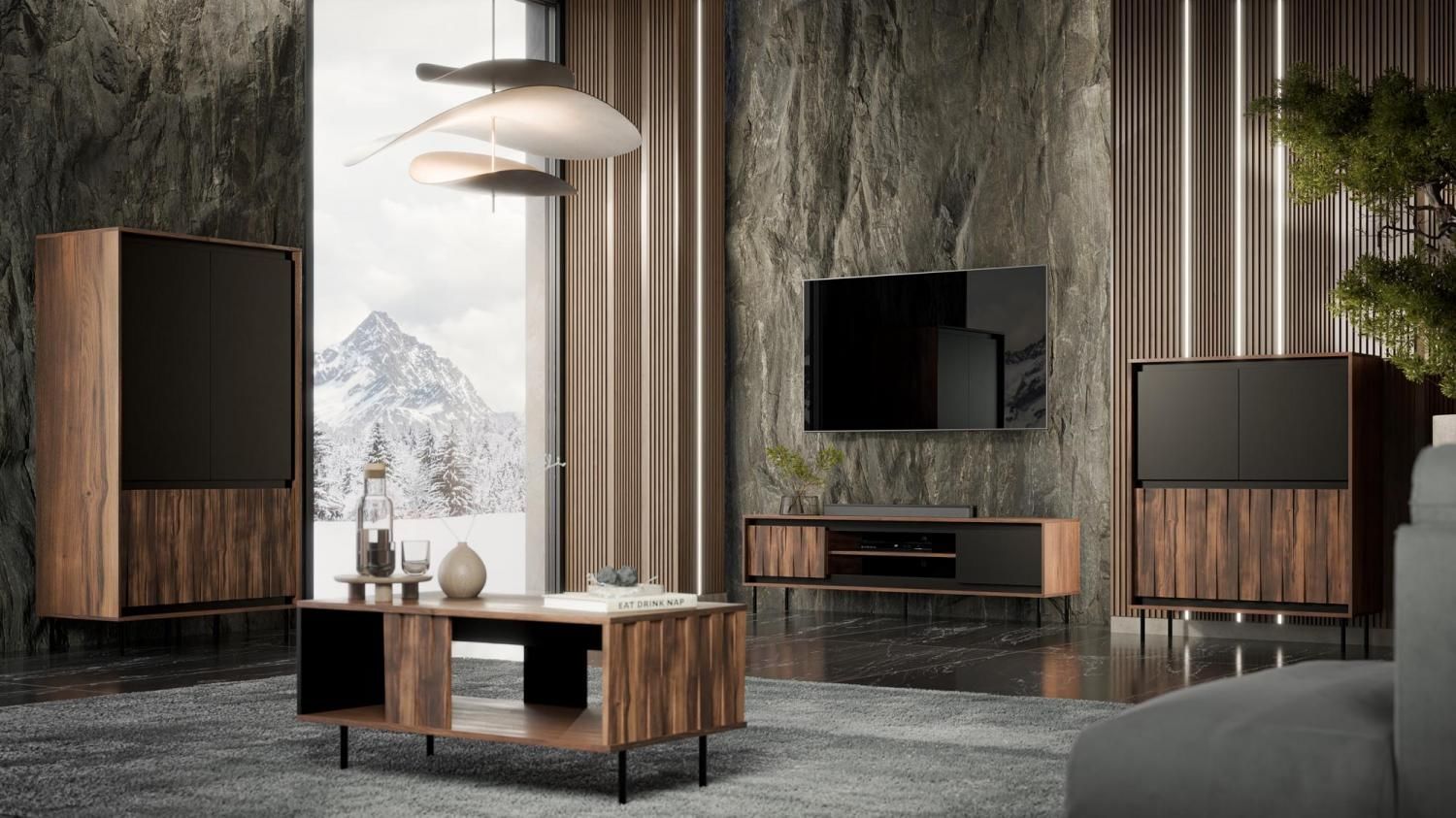 Obývací sestava SWING - je moderní prostorná obývací sestava vyrobena z kvalitního lamina v dekoru ořech a matné černé s černou ocelovou podnoží. Čela dvířek s jemnou ořechovou 3D povrchovou úpravou. Nábytek lze libovolně kombinovat.