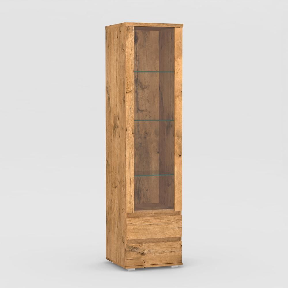 Vitrína REA AMY 21 - je moderní vitrína vyrobena s ABS hranou v barevných dekorech: dub bardolino, bílá, ořech rockpile, buk, graphite, dub vicenza, navarra, kašmír, lancelot a dub canyon.