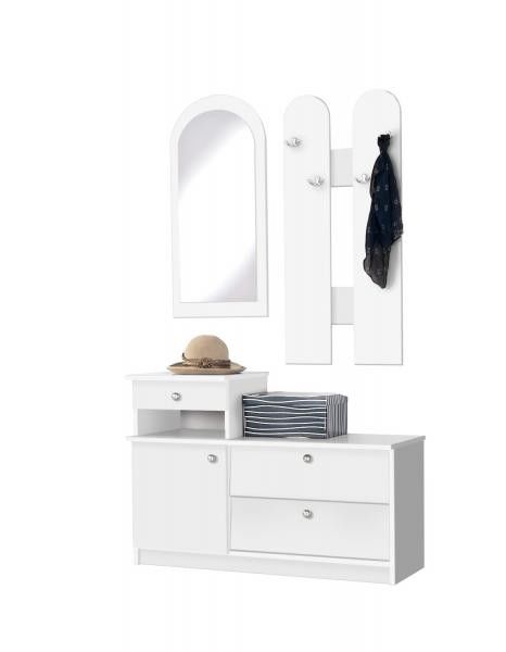 Klasická předsíňová stěna 01 - je praktická předsíňová stěna s botníkem a zrcadlem. Výběr z barevných dekorů lamina: dub artisan, dub riviera, dub catania, bílá a dub sonoma.