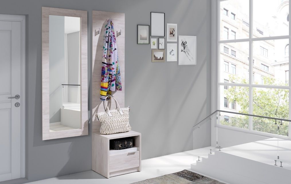 Předsíňová stěna s výklopným botníkem, zrcadlem a praktickou šatní skříni je vhodná i do menších interiérů, předsíně, ale i haly, či dalších místností. Moderní předsíňová stěna je výborné a cenově dostupné řešení pro vaše oblečení a obuv. Praktická předsíňová stěna je vhodná jako úložný prostor na každodenní oblečení, ale i deštníky, boty, hřebeny a další často používané předměty před odchodem z bytu nebo domu. Předsíňová stěna je vyrobena z kvalitního lamina, které věrně imituje reliéf dřeva. Předsíňová stěna je dostupná v oblíbeném barevném dekoru dub monastery.