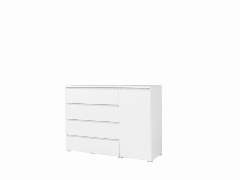 V každém dětském nebo studentském pokoji nesmí chybět dostatek místa pro uložení drobností, knížek, hraček a hlavně oblečení. Moderní široká komoda do studentského nebo dětského pokoje ze série KOSMO je prostorná s čtyřmi šuplíky a jednou uzavíratelnou policí. Tento stylový nábytek je vyroben z kvalitní laminované dřevotřísky s odolnou ABS hranou. Lamino zajistí optimální nosnost a stabilitu, je stálobarevné, snadno se čistí a je nenáročné na povrchovou údržbu. Díky barevnému dekoru bílé,dubu sonoma a dubu riviera je tento studentský nábytek vhodný pro dívky i chlapce všech věkových skupin.