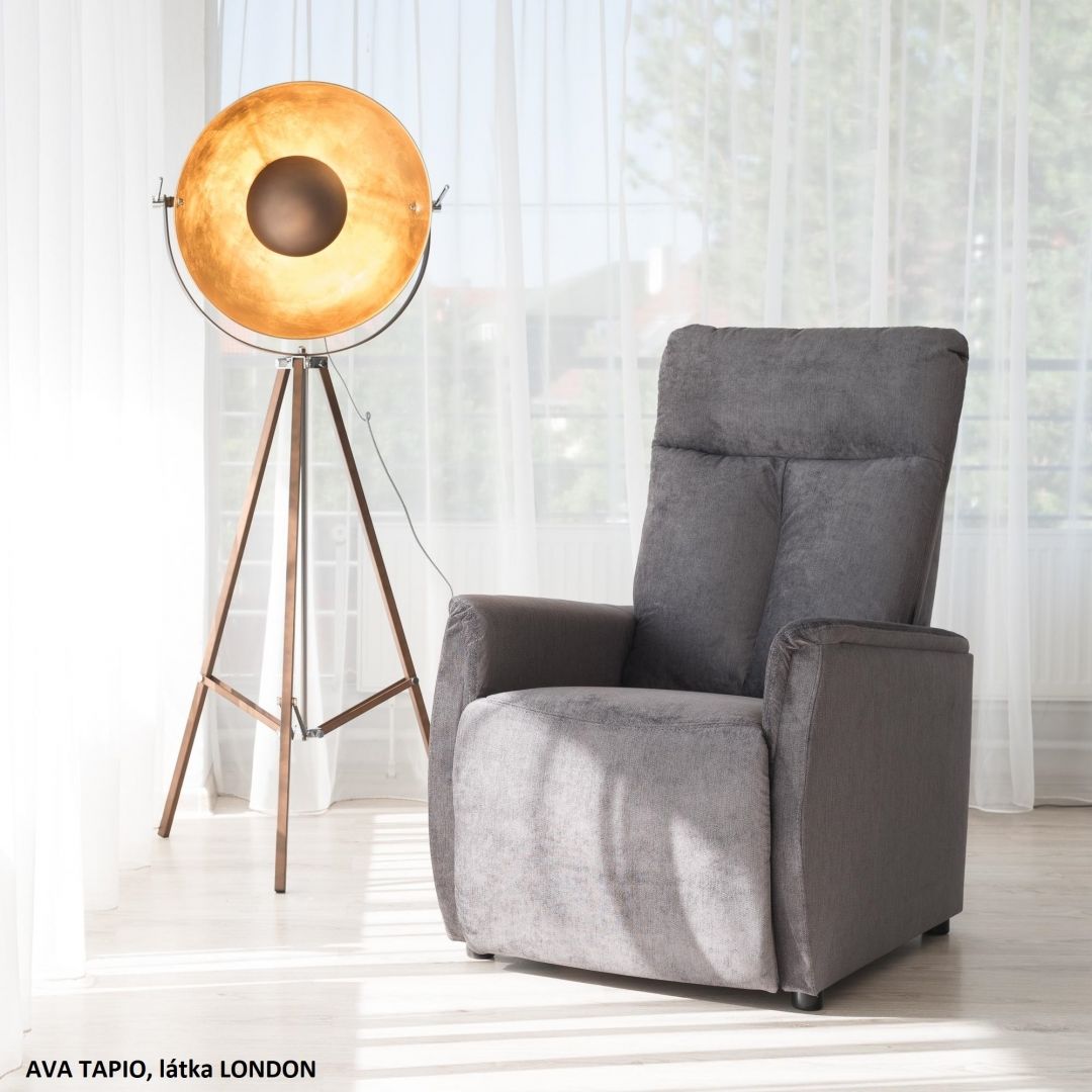 Relaxační křeslo TAPIO - polohovací čalouněné relaxační křeslo s ergonomicky tvarovaným sedákem. V nabídce několik barevných variant potahu. Nosnost křesla 150kg . Akční látky SORO 90 ,91 97.