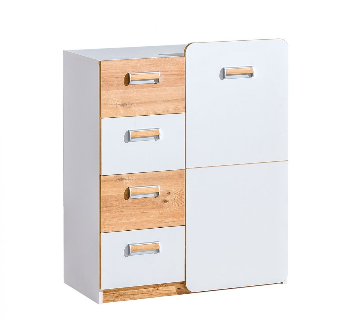 V každém dětském nebo studentském pokoji nesmí chybět dostatek místa pro uložení drobností, knížek, hraček a sportovních trofejí. Moderní kombinovaná komoda do studenského nebo dětského pokoje ze série LORENTO skvěle kombinuje úložný prostor ve formě 4 šuplíků a dvířek s hravým designem. Tento stylový nábytek je vyroben z kvalitní laminované dřevotřísky s odolnou ABS hranou, která zajistí optimální nosnost a stabilitu. Tento materiál je stálobarevný, snadno se čistí a je nenáročný na povrchovou údržbu. Díky výběru barevných variant je tento studentský nábytek vhodný pro dívky i chlapce je vhodné pro všechny věkové skupiny. Vhodný nábytek dokáže oživit každý dětský a studentský pokoj.