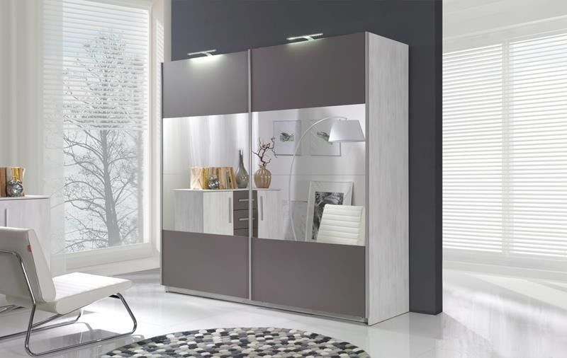 Šatní skříň DION II. - je prostorná šatní skříň s LED osvětlením vyrobená z lamina tl. 16 mm s posuvnými dveřmi se zrcadlem na prostředku v dekorech san remo/šedá nebo norská borovice/šedá.
