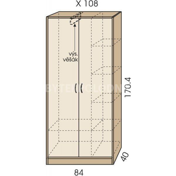 Šatní skříň X 108 - praktická šatní skříň s policemi a držákem na ramínka od českého výrobce vyrobena z lamina tl. 18 mm s ABS hranou v 12 barevných dekorech v kombinaci pastelovými barvami.