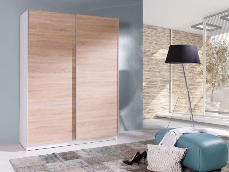 Šatní skříň BATUMA 4 - je vyrobena z lamina tl. 16 mm s ABS hranou, v kombinaci bílé a dubu sonoma s posuvnými dveřmi s kováním SEVROLL.