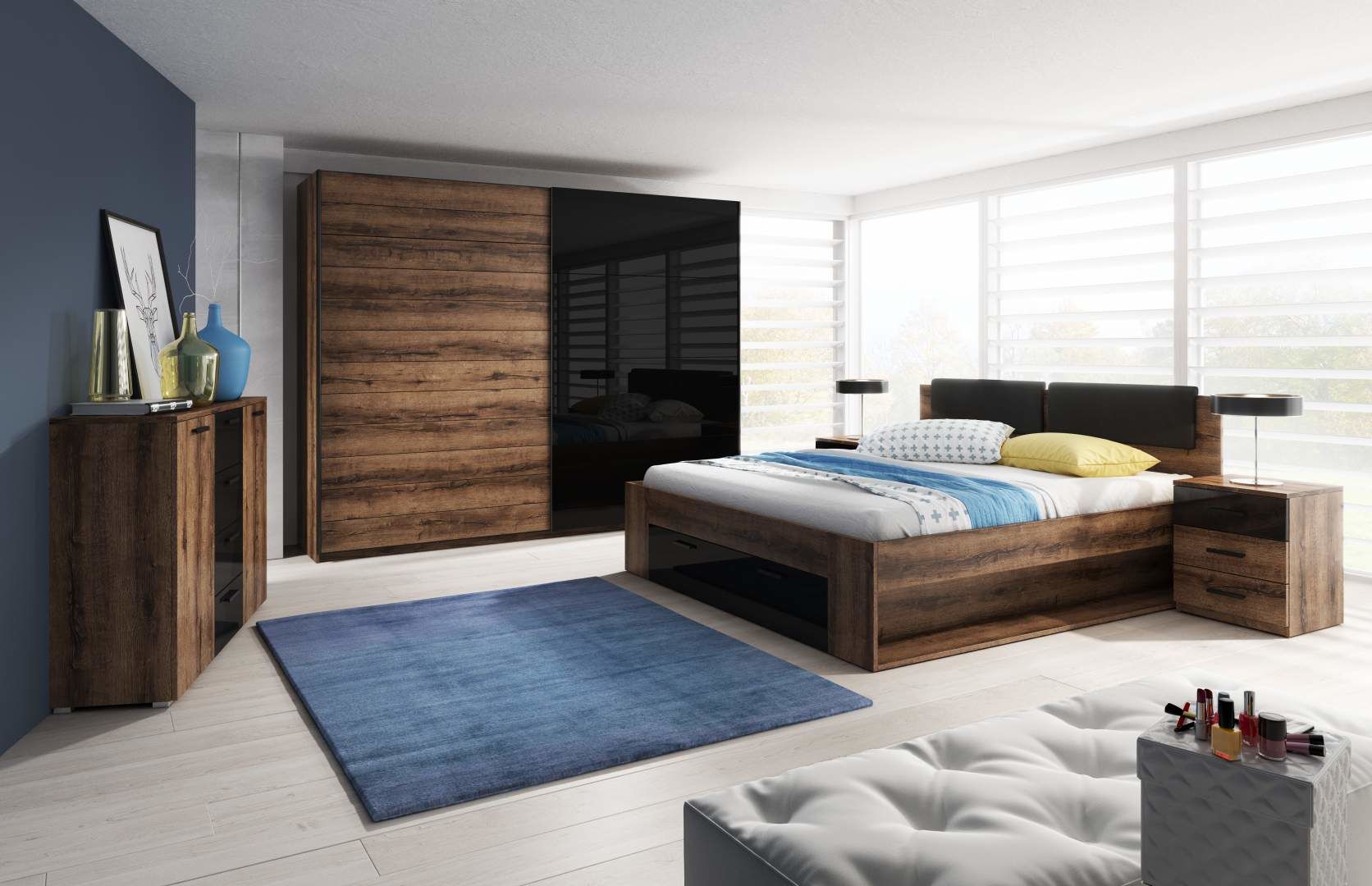 Ložnice GALAXY - Dub Monastery/ černý lesk - je moderní kompletní sestava z kolekce GALAXY s manželskou postelí, dvěma nočními stolky, komodou a šatní skříní v krásném barevném provedení Dub Monastery/ Dub Monastery - černá.
