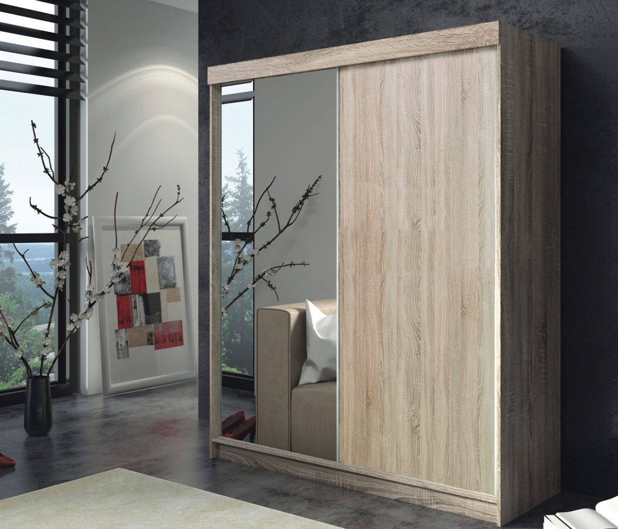 Šatní skříň ARUBBA - je prostorná skříň s posuvnými dveřmi vyrobená z lamina v oblíbených barevných dekorech v kombinaci se zrcadlem.
