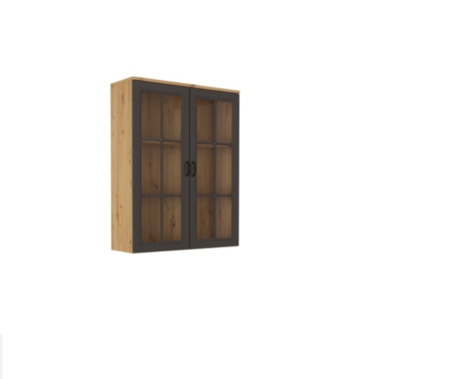 - je moderní prostorná vitrína s prosklenými dvířky vyrobena z lamina v dekoru dub Artisan a šedý mat. Vitrína je vybavena policemi. Úchytky jsou černé kovové.