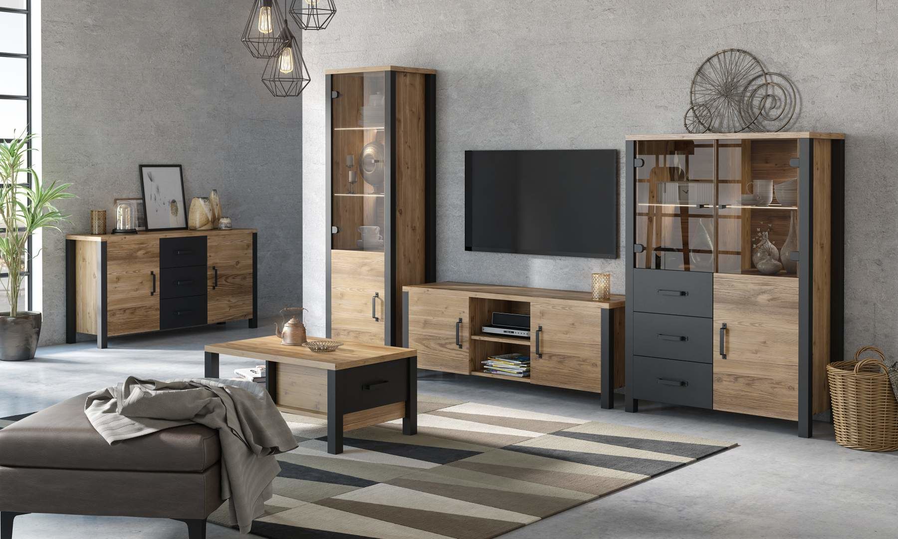 Obývací sestava OLIN I - je moderní sestava do obývacího pokoje vyrobena z kvalitního lamina s ABS hranou v dekoru Appenzellský smrk. Sestavu lze kombinovat s nábytkem z modelové řady OLIN WM.