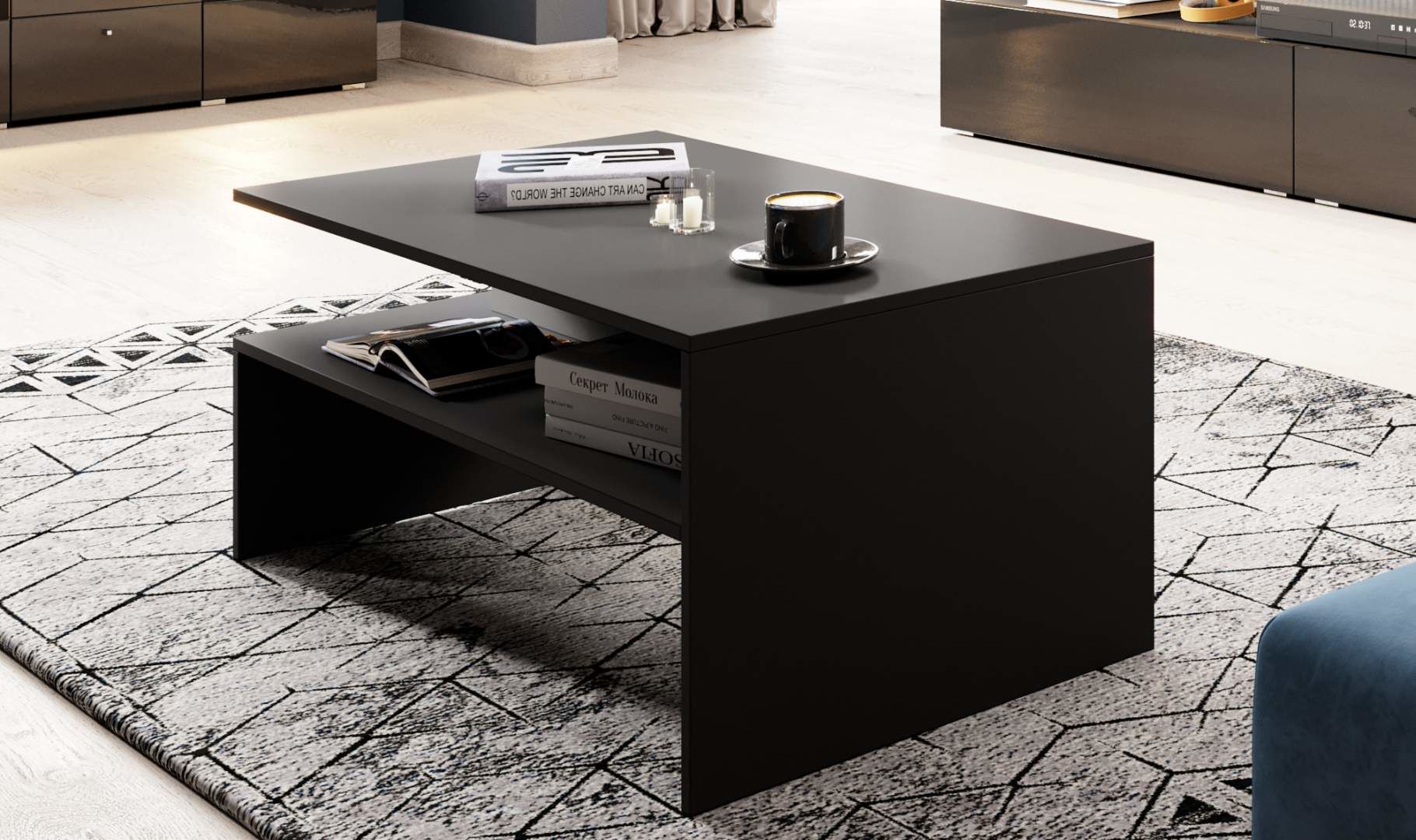 Elegantní konferenční stolek vyroben v kombinaci z odolného lamina v barvě Černého lesku v kombinaci s černým supermatem. Tento moderní konferenční stolek je obdélníkového tvaru s praktickou poličkou na ukládána např. knih, časopisů, ovladačů. Moderní konferenční stolek je vhodný do obývacího pokoje, pracovny nebo také kanceláře. Díky použitým materiálům je konferenční stolek velmi pevný a stabilní, což zaručuje také jeho dlouhou životnost.