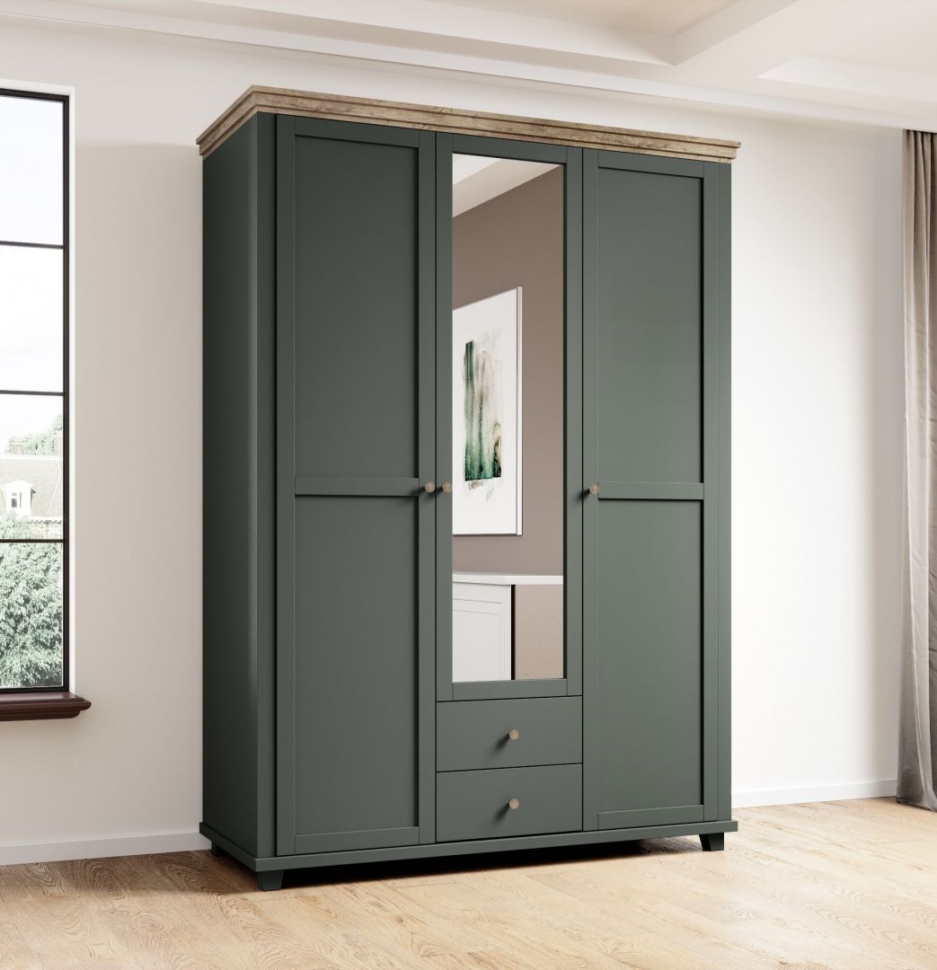 Šatní skříň I EVORA - třídveřová šatní skříň s prakticky řešeným vnitřním uspořádáním Vám zaručí, že každý kousek oblečení naleznete přehledně na svém místě. Nabízíme v barevném provedení Dub lefkas - zelená.