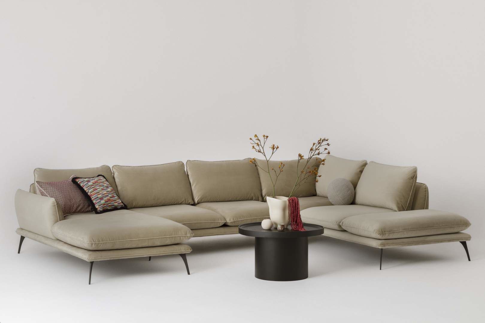 - je luxusní a designová sedací souprava do U s neotřelým výrazem na vysokých nohách. Široký výběr kvalitních potahových látek včetně omyvatelných.