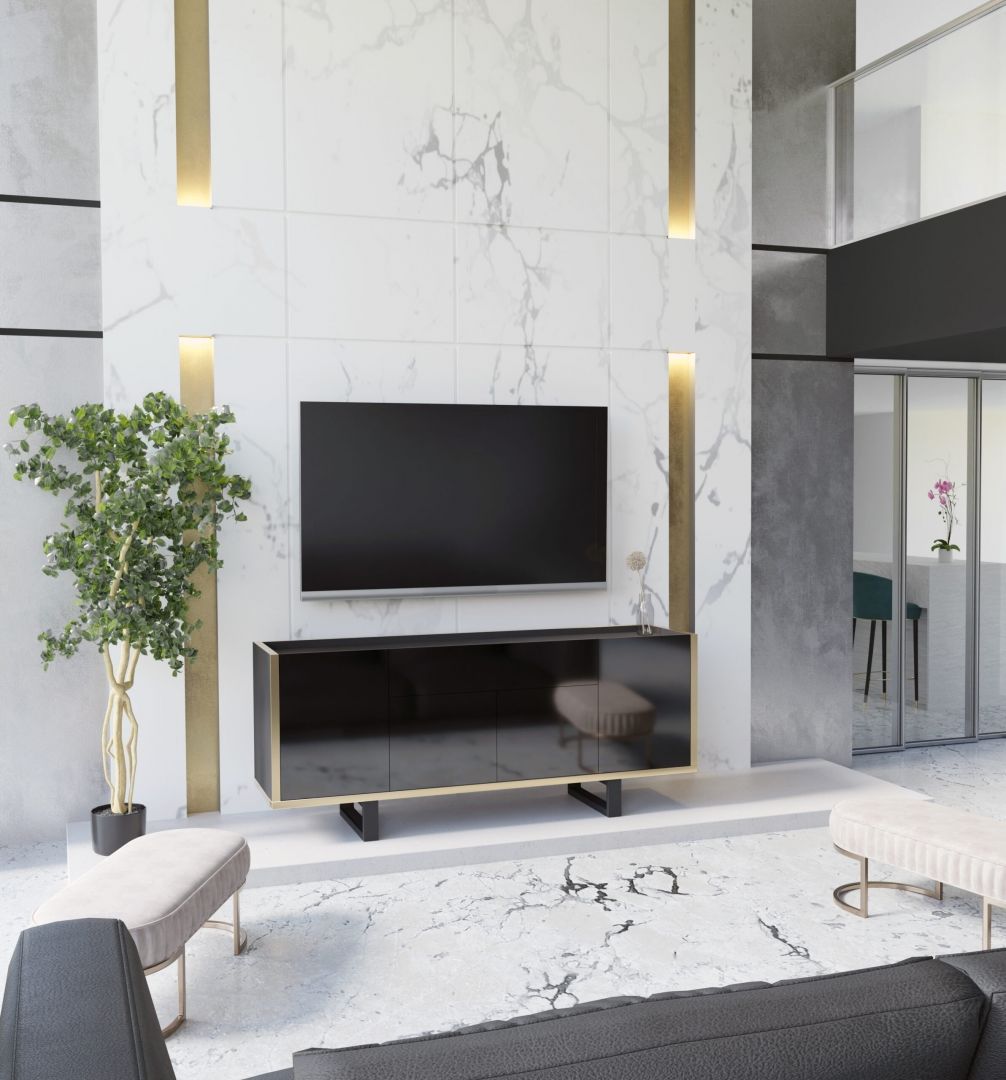 - je moderní televizní stolek vyroben z lamina v barevné kombinaci černá lesk / zlatá , černá lesk / stříbrná.