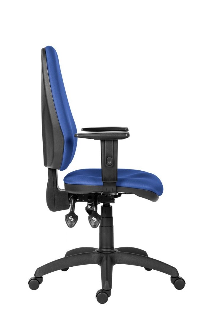 Kancelářská pracovní židle s vysokým opěrákem, ASYN - asynchronní mechanismus, nezávislé nastavení úhlu sedáku a opěráku s možností aretace v libovolné pozici, nastavení výšky opěráku mechanismem up-down, výškové nastavení sedáku plynovým pístem, plastová nebo ocelová chromovaná báze, kolečka Ø 50 mm pro měkké podlahy, volitelné područky, český výrobek.