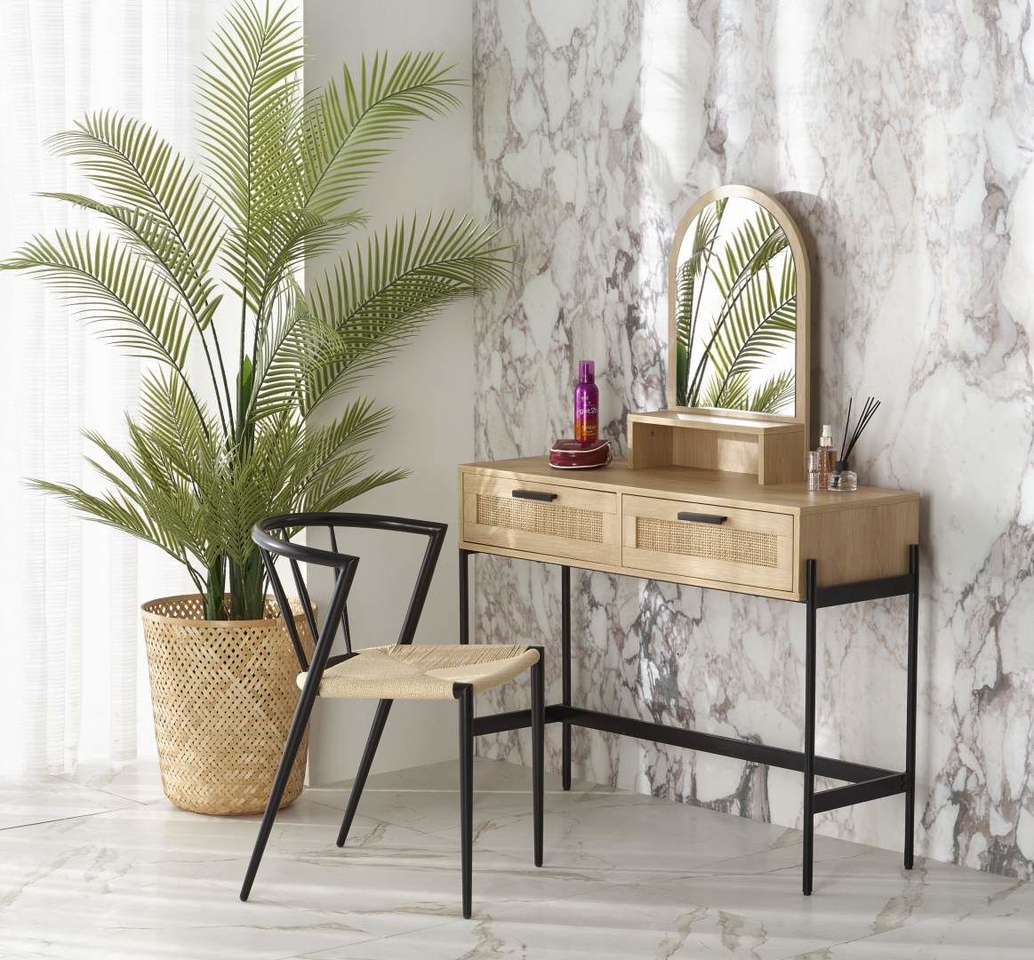 Originální design, tradiční řešení šuplíků, trendy povrchová úprava v přírodním provedení a kvalitní použité materiály při výrobě, to vše vám stůl může nabídnout. Materiál dýhované nábytkové desky je všeobecně kvalitnější než lamino. Toaletní stolek je doplněný o detaily z přírodního ratanu. Konstrukce velmi stabilní. Je vhodný do studentského pokoje, pracovny anebo ložnice. Díky praktickým rozměrům se stane spolehlivým pomocníkem v každé domácnosti.