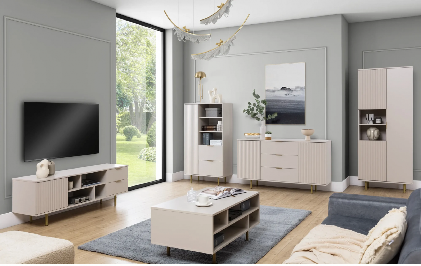 Obývací sestava Nubi - je moderní sestava do obývacího pokoje vyrobena z kvalitního lamina v dekoru Kašmír se zlatými nožičkami. Sestavu lze kombinovat s nábytkem z modelové řady Nubi.