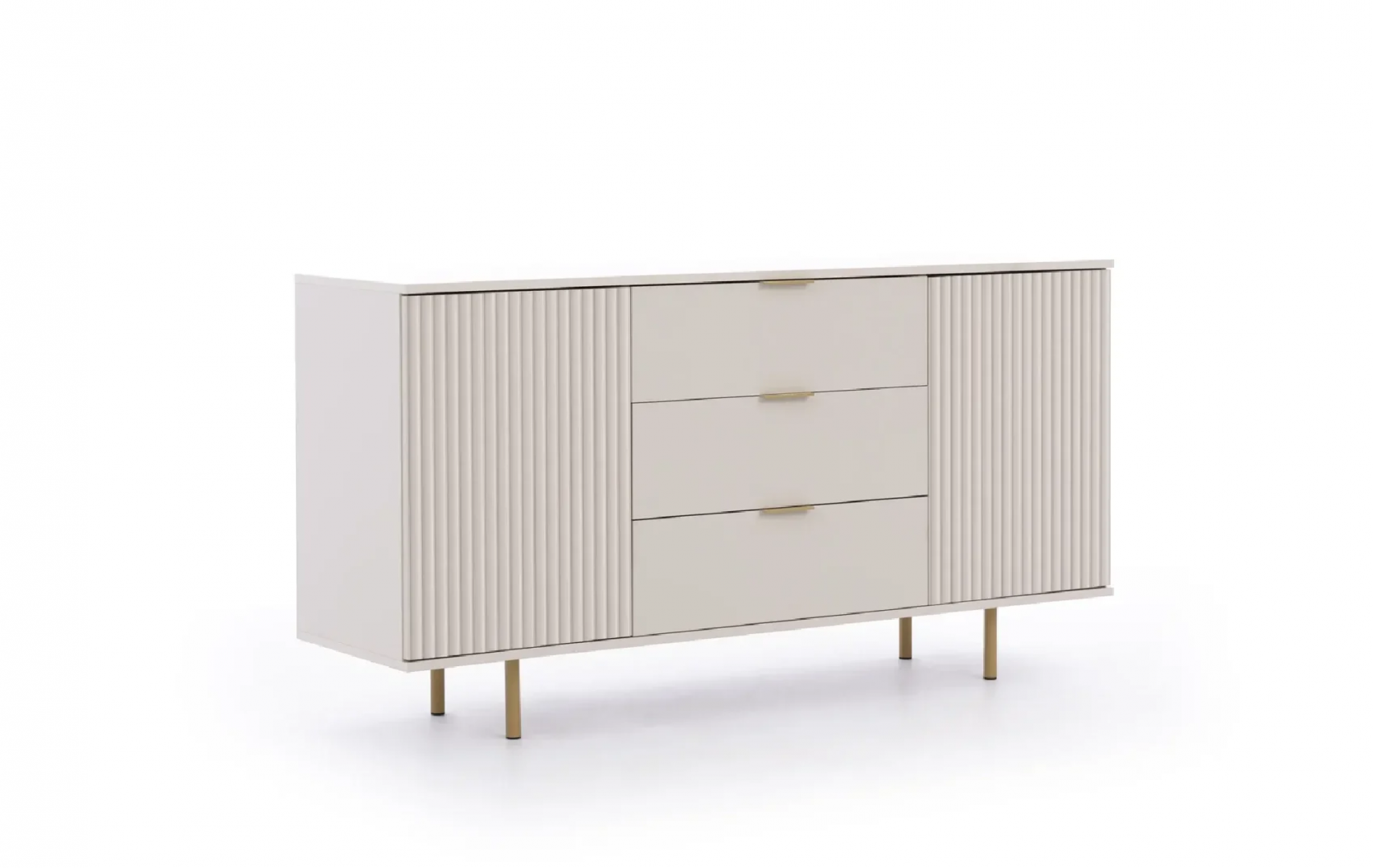 Vneste originalitu s precizním řemeslným zpracováním v podobě moderní široké komody. Elegantní komoda dodá Vašemu interiéru díky svému nadčasovému designu zajímavý vzhled a zaslouženou pozornost. Je k dostání v dekorech Černý mat nebo Kašmír v kombinaci se zlatými nožkami. Tento praktický kus nábytku se hodí díky svému modernímu designu nejen do obývacího pokoje, ale také do pracovny nebo kanceláře. Komoda je vyrobena z kvalitního lamina tloušťky 16 mm s ABS hranou. Tuto elegantní širokou komodu lze zakoupit samostatně a nebo jako součást variabilního systému Nubi.