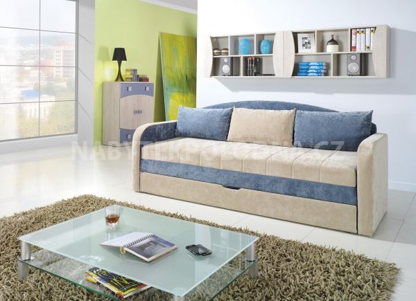 Pohodlná rozkládací pohovka s velkými opěrnými polštářky, kterou lze nechat složenou anebo ji lze rozložit a proměnit tak pohovku na postel pro návštěvu nebo na místo na povalování a oddechování. Barvu čalounění lze objednat v příjemných barvách zelené, modré a vřes (světle fialové). Všechny tyto barvy jsou v kombinaci se světle béžovou. Potahová látka má kvalitní povrchovou úpravu, která zabraňuje vsakování tekutin a ulehčuje tím čištění. Ve spodní částí rozkládací pohovky je úložný prostor, do kterého lze uložit lůžkoviny nebo deky.