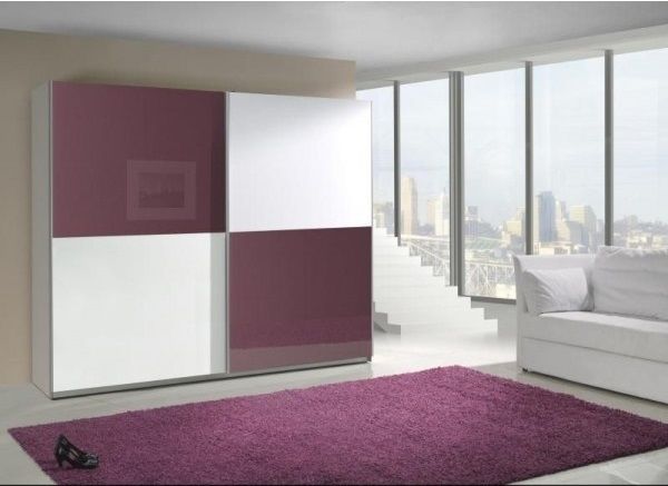 ŠATNÍ SKŘÍŇ LUX X. je vyrobená z lamina tl. 16 mm s ABS hranou v barevné kombinaci: bílý korpus, dveře s fialovým a bílým leskem. Posuvné dveře s kvalitním Hettich kováním.