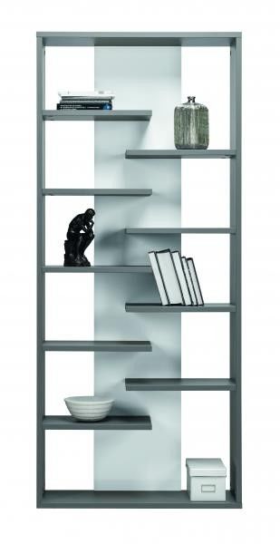 Regál vysoký ZOONDA 08 - je moderní policový regál vyroben z lamina s ABS hranou v neutrální barevné kombinaci šedé a bílého lesku.