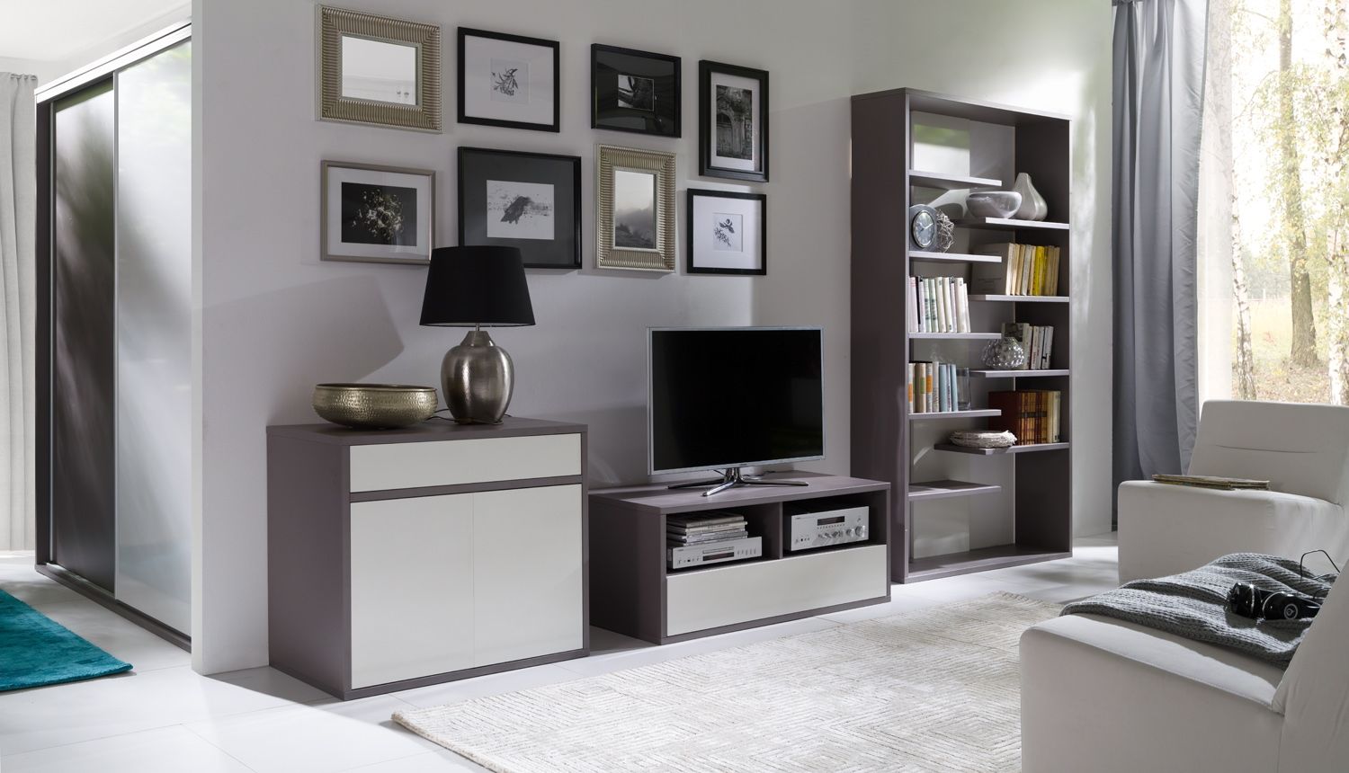 je moderní sestava do obývacího pokoje vyrobena z kvalitního lamina v barevné kombinaci šedé a bílém lesku.