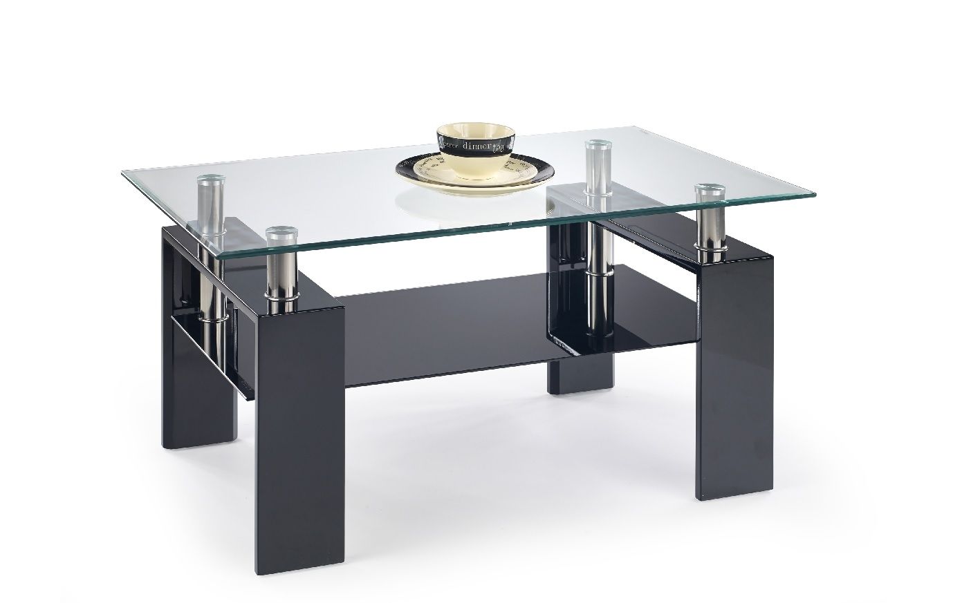 Moderní konferenční stolek, který skvěle doplní Váš interiér. Konferenční stolek je obdélníkového tvaru s jednou odkládací policí. Deska stolu vyrobena ze skla, nožičky z lakovaného MDF, spodní deska z černého skla. Díky svému jednoduchému designu je stolek vhodný do většiny interiérů.