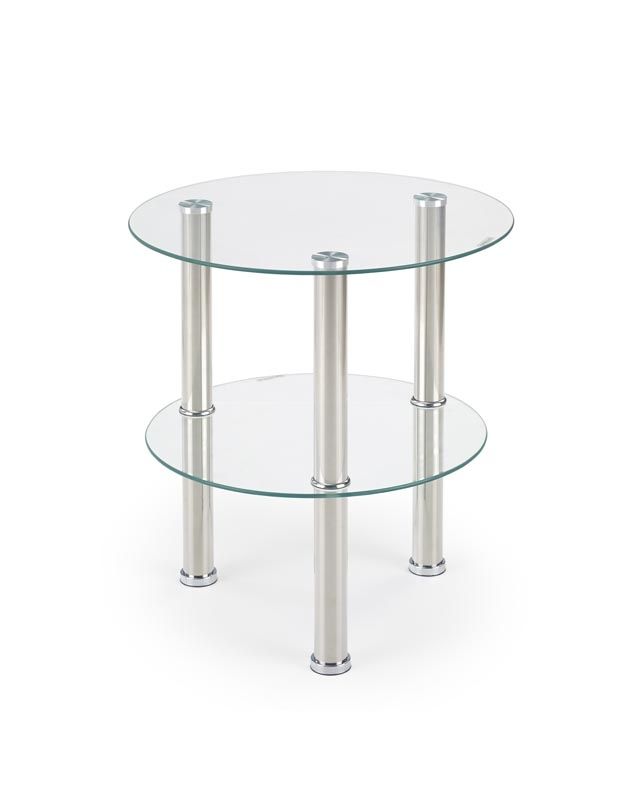 Konferenční stolek moderního designu v kombinaci skla a nerezu. Tento pěkný konfereční stolek je kulatého tvaru se spodní poličkou na odkládání např. knih, časopisů, ovladačů, apod. Díky své velikosti je stolek vhodný do menších interiérů.