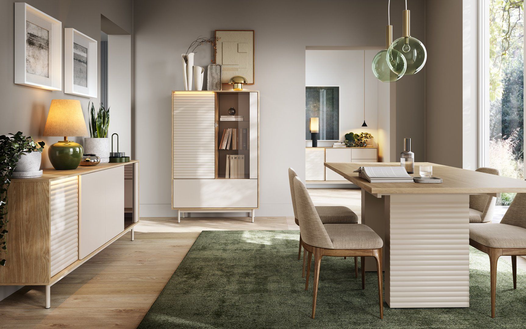 Jídelní sestava TILA - je moderní sestava do jídelny dekoru dub olejový / kašmír. Otevírání dvířek za pomoci systému Push to open.