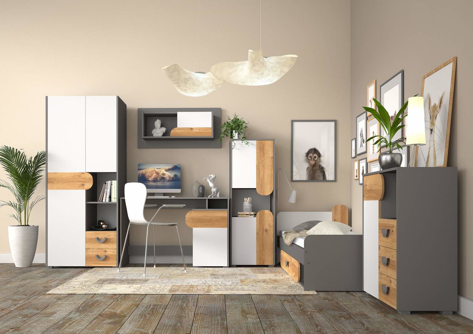 Studentský pokoj CARINI II - je moderní sektorová sestava od studentského pokoje, která je vyrobena z kvalitního lamina v dekoru dub Nash/ bílá matná/ grafit