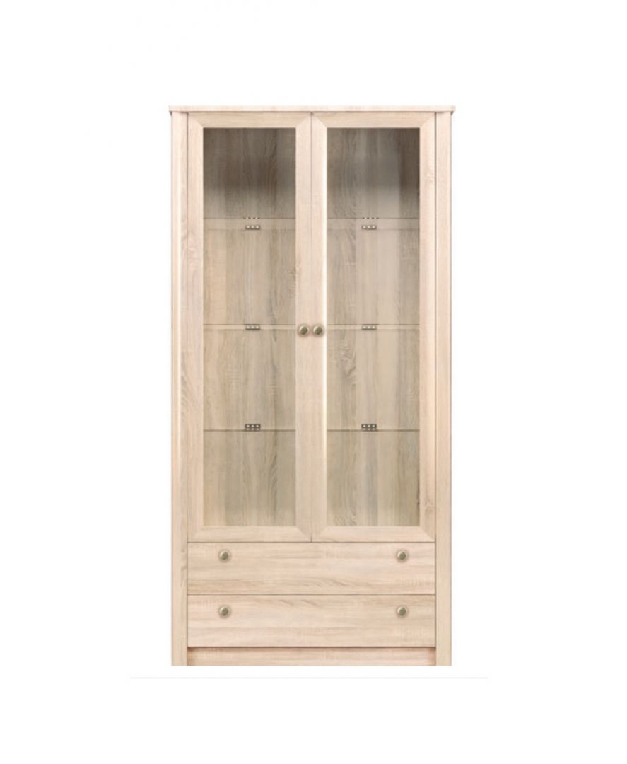 Vitrína FINEZIA F 22 s LED osvětlením - je elegatní a prostorná vitrína se šuplíky v spodní části, vyrobena z lamina v dekoru dub sonoma.