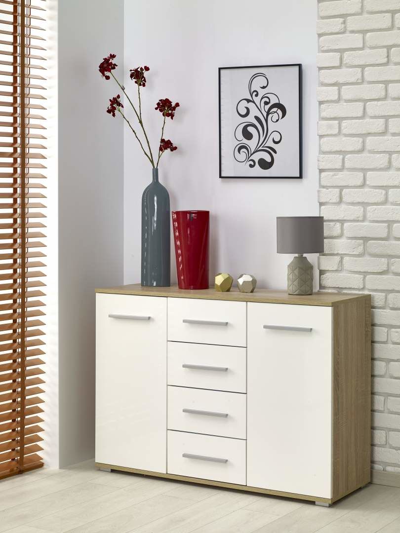 Kombinovaná komoda LIMA KM-4 - je moderní komoda vyrobená z lamina s ABS hranou v dekoru: dub sonoma v kombinaci s bílou, v dubu sonoma, nebo bílé.