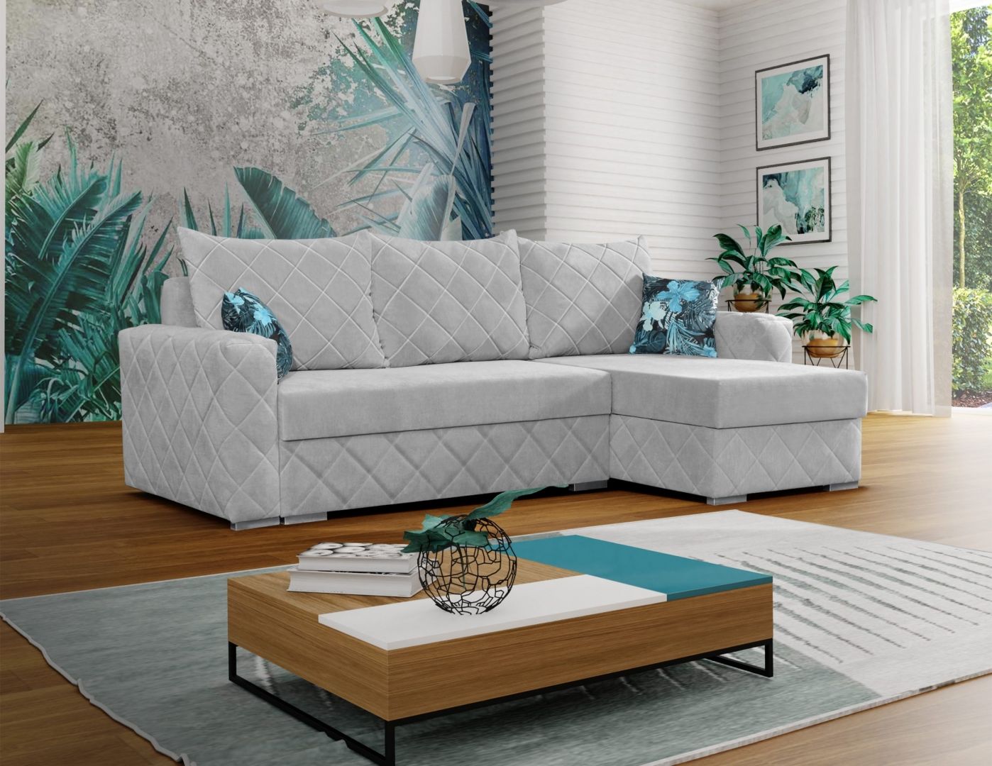 Rohová sedací souprava MINERVA - pohodlná sedací souprava s funkcí rozkladu na lůžko 128 x 204 cm a úložným prostorem. Sedací souprava má volně ložené polštáře.