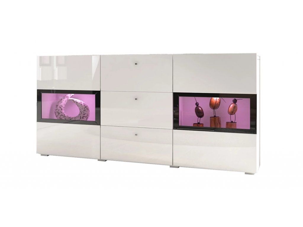 Komoda BAROS bílá - moderní kombinovanou komodu nabízíme v bílém barevném odstínu v kombinaci s vysokým leskem na dvířkách a černými rámečky. Komoda je vyrobena z kvalitního lamina. Komodu lze za příplatek vybavit barevném RGB LED osvětlením.