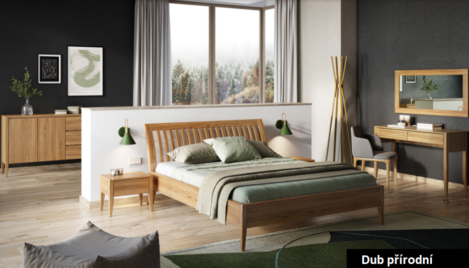 Postel lze doplnit o noční stolky, komody a skříně z masivu dubu.