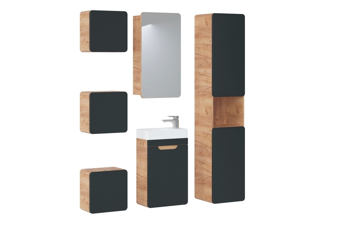 Arusa Cosmos je mimořádná kolekce koupelnového nábytku, která zaujme svým lehkým a moderním designem. Korpusy v barvě dřeva v kombinaci s tmavými čelními plochami vytvářejí jemný celek. Zaoblené hrany všech skříněk dodávají kolekci originální charakter a lehkost. Přední strany jsou bez úchytů