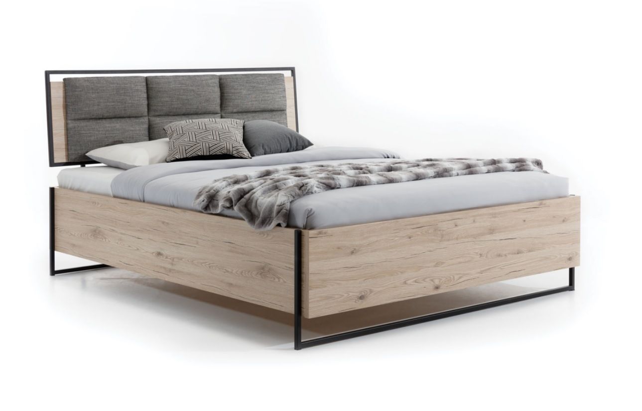 Manželská postel GLAS LOOFT je vyrobena z lamina v barveném provedení dub bordeaux v kombinaci s čalouněným čelem v látce Dazza 13 (šedá) a černým kovovým rámem.