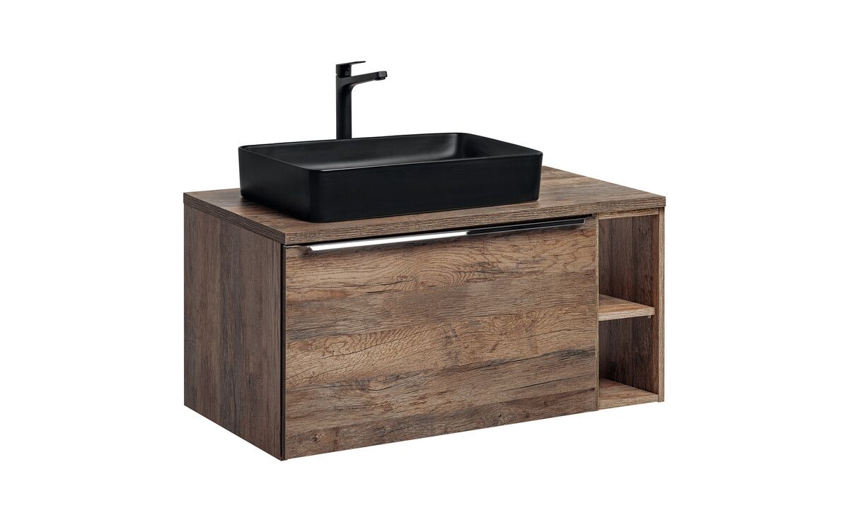 Ve skvělém moderním vzhledu se vyznačuje nejvyšší kvalitou zpracování materiál lamino v provedení Dub Santa Fee Vintage. Skříňky mají tichý uzavírací systém, organizér do zásuvky a se zásuvkou ve skříňkách se zrcadlem.