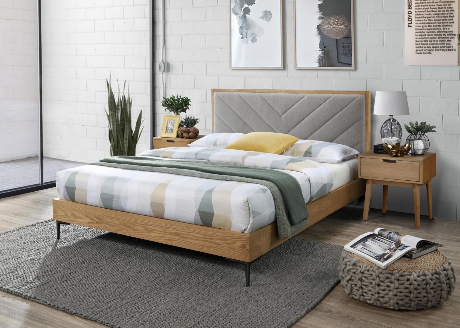 Manželská postel MARGARITA 160 - je moderní čalouněná postel vyrobená z lamina v přírodním barevném odstínu, masivu a látky v oblíbené šedé barvě. Rozměr lůžka 160 x 200 cm.