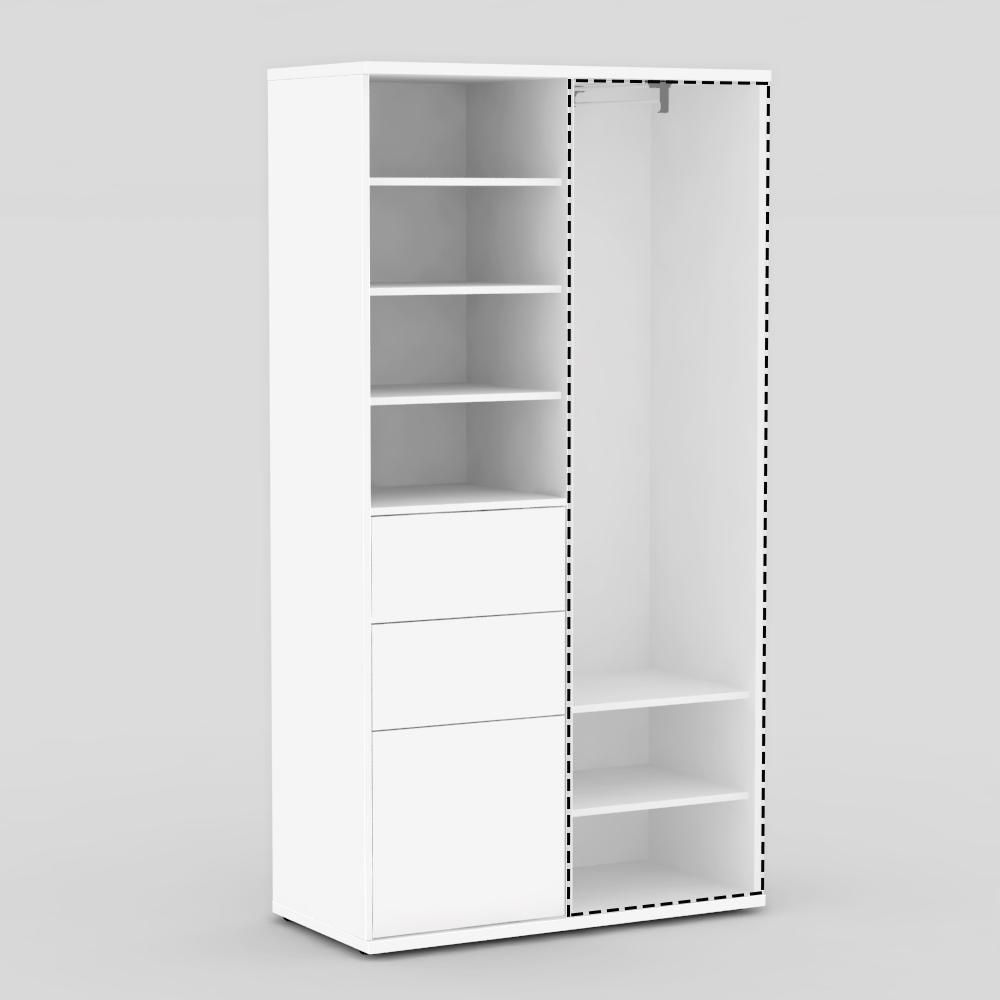 Skříňka má přípravu na 10 polic. V základní výbavě je jedna věšáková tyč, 3 zásuvky a 5 polic, které si můžete umístit dle vlastního výběru.